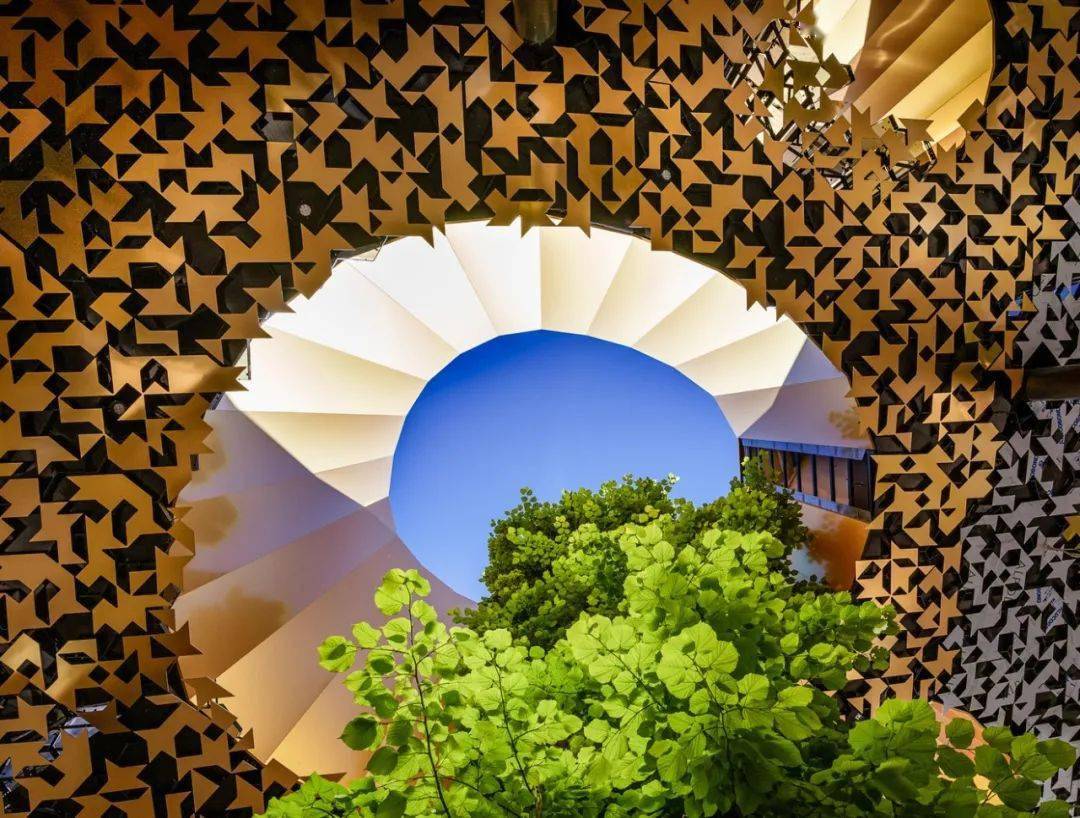 屋顶的结构没有任何直角,也几乎没有相同的两个元素,全部都是独一无二的,上头有将近 100 个有机轮廓的洞,让公园绿意树景得以渗透到内部。