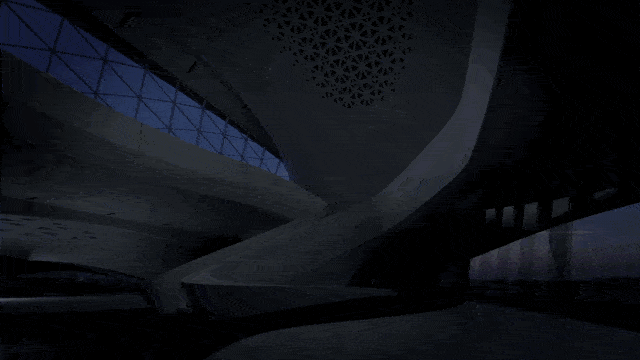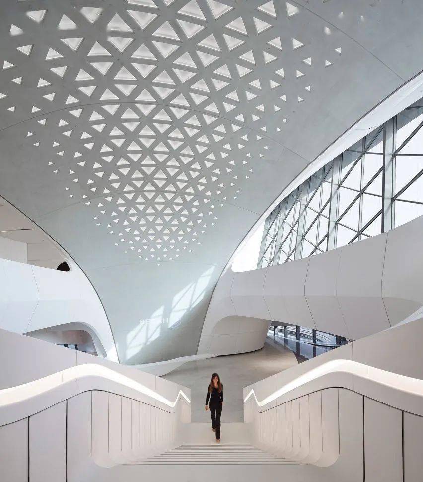 在内部,建筑两侧的“沙丘”通过中央庭院相互连接,扎哈·哈迪德事务所的建筑师将其描述为“建筑内的绿洲”。
