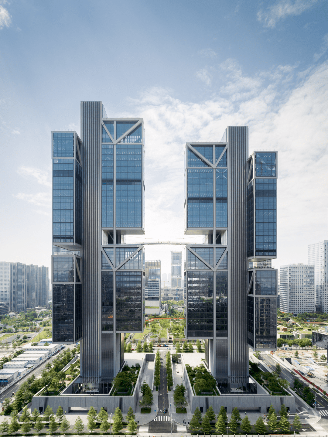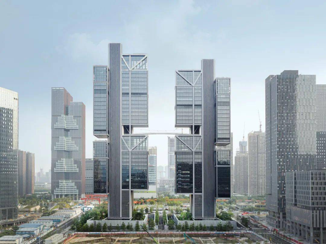 整个项目由东、西两栋超高层塔楼组成,每栋塔楼各有六个巨大的“玻璃体块”,依托核心筒,错落有致地悬挂在延伸出来钢结构上。