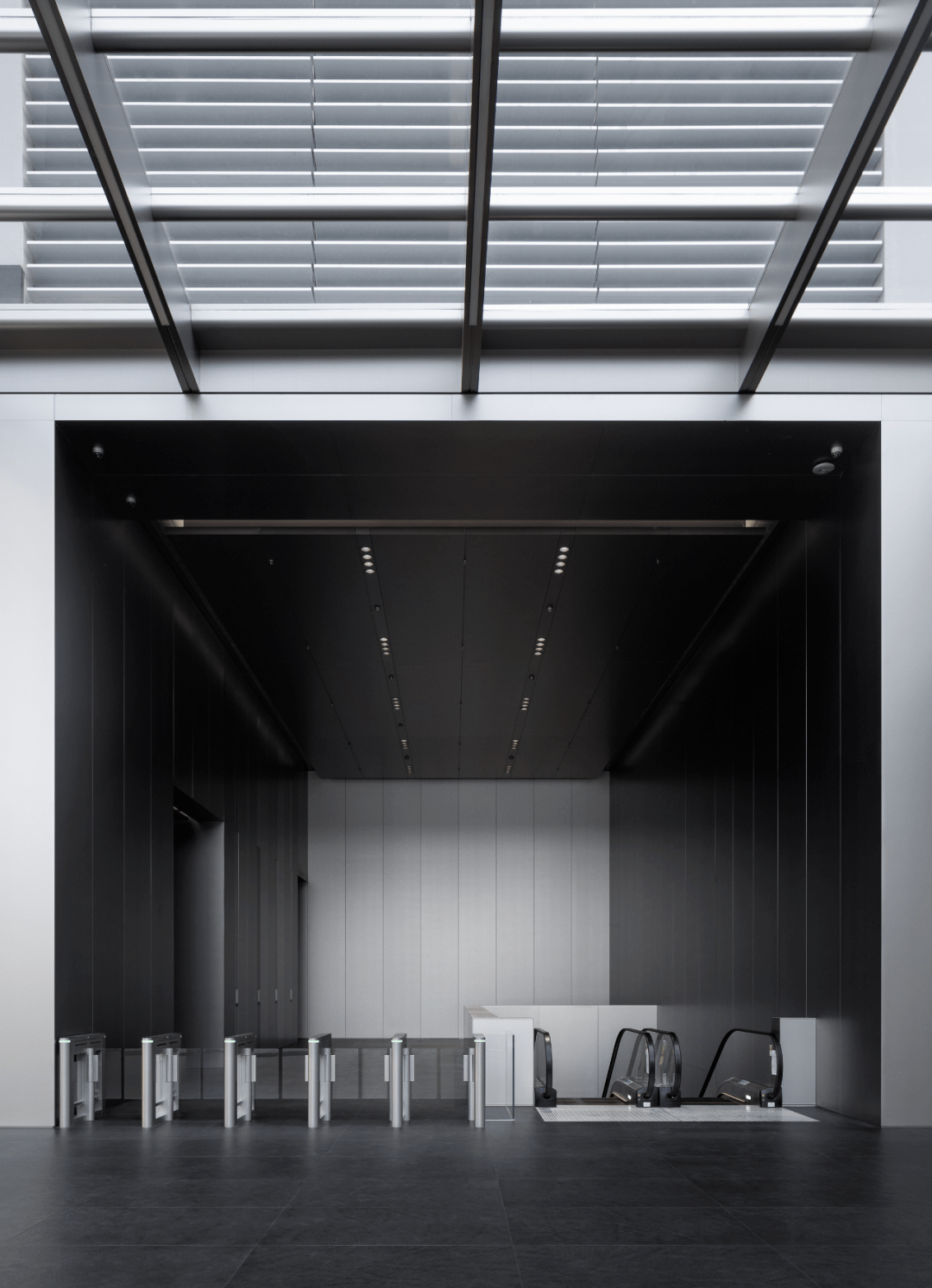 内部墙面采用定制深灰色金属材料,建筑内部的设备面板和操作系统全部内嵌在墙体中,极简的工业风设计又不失科技感。