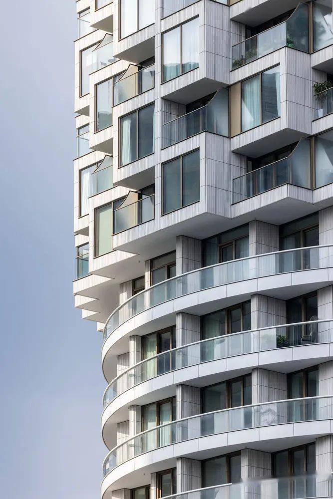 贯穿建筑表皮的平行线条向上延伸,流线型的建筑立面充满了动感,局部像百叶窗一样被轻轻扒开,绿植从内部向外探出,为整个建筑带来生机与活力。